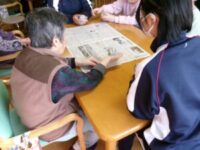 「新聞転がしゲーム」では、2つのチームに分かれ、新聞紙で作ったボールを転がして的に入れ、点数を競いました。ボールを転がす回数が増えるにつれて利用者さんの笑顔が増え、とても和やかな雰囲気で楽しむことができました。